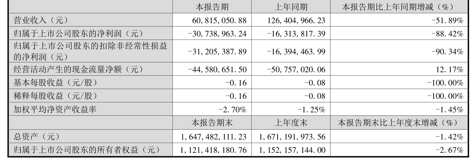 中证智能财讯吉大正元(003029)4月26日披露2025年第一季度报告。公司实现营业总收入6081.51万元,同比下降51.89%;归母净利润亏损3073.9万元,上年同期亏损1631.38万元;扣非净利润亏损3120.54万元,上年同期亏损1639.45万元;经营活动产生的现金流量净额为-4458.07万元,上年同期为-5075.7万元;报告期内,吉大正元基本每股收益为-0.16元,加权平均净资产收益率为-2.70%。