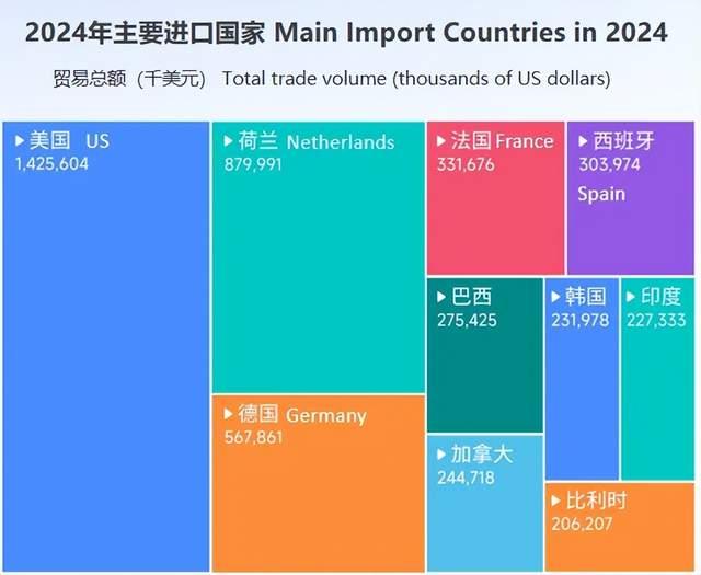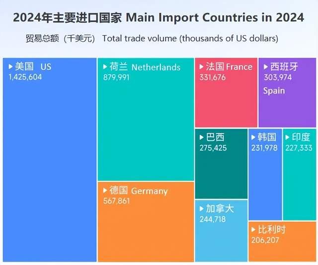 以维生素原及维生素(HS:2936)为例,腾道数据显示,2024 年美国、荷兰、德国、法国为主要进口国,其中美国因医药、食品、饲料产业发达及保健品市场规模庞大,进口额位居首位。但值得关注的是,中美贸易摩擦背景下,美国对中国原料药实施的关税政策已对贸易格局产生多重影响。